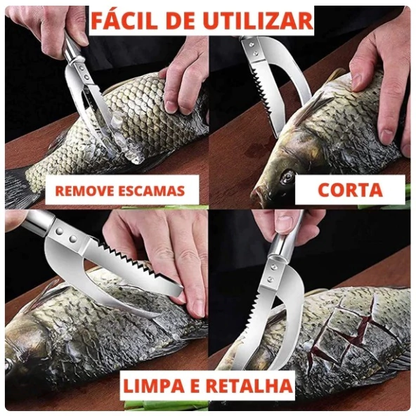 Faca para peixe de alta qualidade, com seus dentes de serra duplos para remover rapidamente as escamas e lâminas em dois sentidos para cortar, remover os orgãos internos e retalhar o peixe. É muito prático!