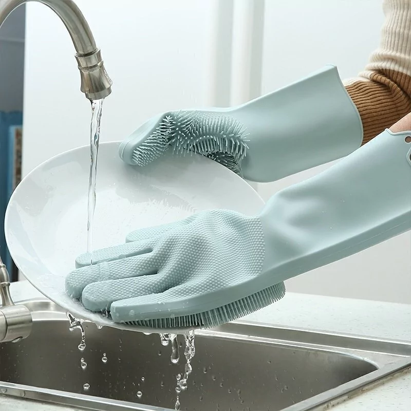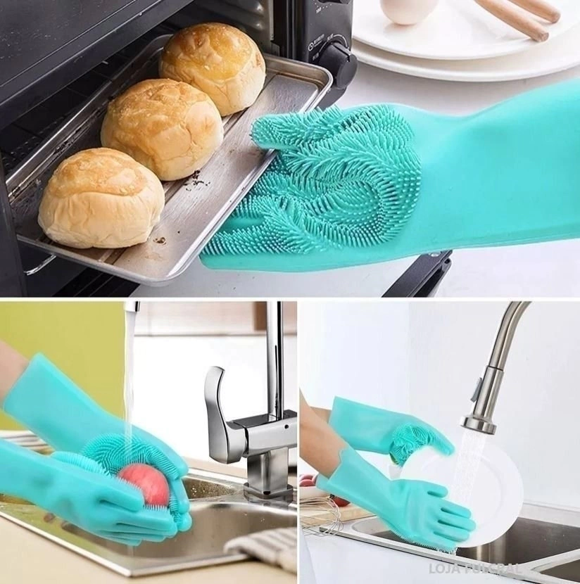 Com as luvas mágicas lavar louça se tornou super fácil, pois você pode jogar detergente direto na luva e esfregar normalmente, limpando muito mais que as buchas comuns.