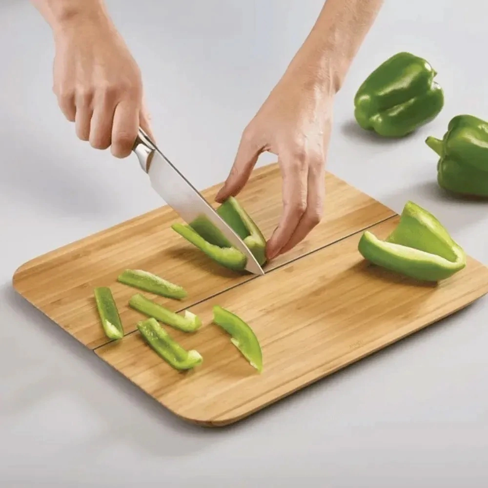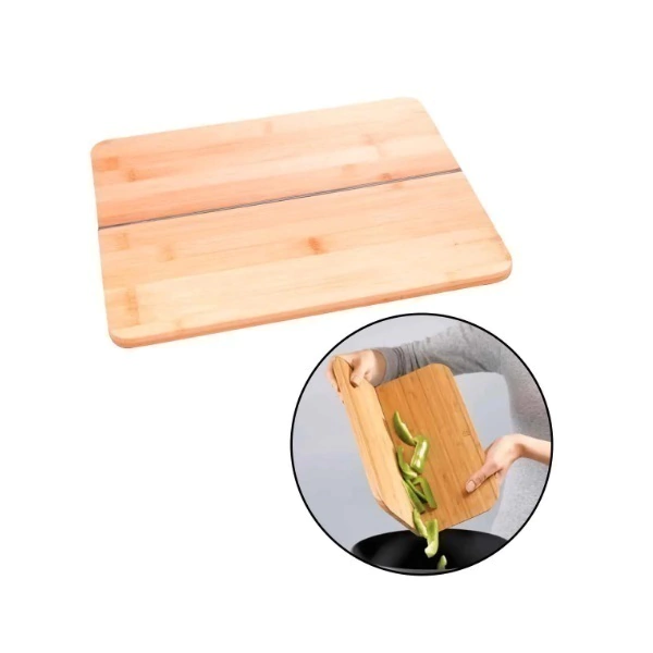 Aumente a eficiência na cozinha com a tábua de corte dobrável. Feita de bambu sustentável e equipada com uma dobradiça de silicone inovadora, ela transforma-se em uma rampa prática para transferir alimentos picados diretamente para a panela. Ideal para cozinheiros que prezam por praticidade e organização. A limpeza é tão fácil quanto seu uso, garantindo mais tempo para você desfrutar de suas criações culinárias. Com a capacidade de dobrar-se, a tábua se torna fácil de armazenar em espaços reduzidos, como uma gaveta por exmeplo, otimizando sua cozinha e proporcionando praticidade.